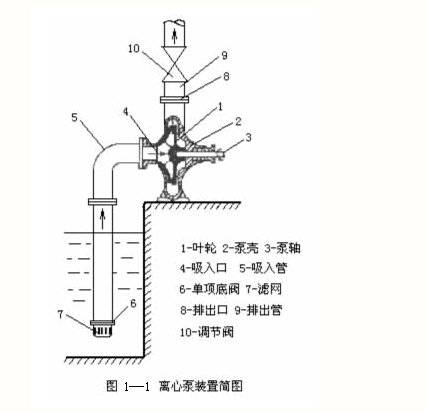 為了使離心泵能正常工作,離心泵必須配備一定的管路和管件,這種配備有一定管路系統(tǒng)的離心泵稱為離心泵裝置。下圖所示為離心泵的一般裝置示意圖,主要有底閥、吸入管路、出口閥、出口管線等。