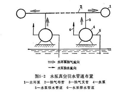 如果泵站中有兩臺以上的水泵,則可將水環(huán)式真空泵進(jìn)氣管與抽氣母管相通,每臺泵的泵殼頂部通過抽氣支管與抽氣母管相連。在每個(gè)支管上都安裝一個(gè)閥門,以便可以單獨(dú)對每一臺泵抽氣。有時(shí),為了備用起見,可以設(shè)置兩臺水環(huán)式真空泵,每一臺的進(jìn)氣管上都安上閥門。當(dāng)一臺發(fā)生故障時(shí),可以關(guān)閉該泵上的進(jìn)氣閥門,利用另外一臺抽氣,不致耽誤水泵的起動(dòng)。正常情況下兩臺水環(huán)式真空泵可對水泵同時(shí)抽氣,以加快引水速度。整個(gè)管路布置如圖5-2所示。