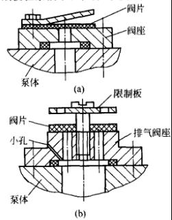 排氣閥是旋片泵主要易損件之一,將影響泵的抽氣性能并產(chǎn)生噪聲。排氣閥有兩種形式:一種是用橡膠墊做閥片,如圖1(a)所示;另一種是用布質酚醛層壓板或彈簧鋼片做閥片,如圖1(b)所示.排氣閥必須浸在泵油中.在排氣過程中,壓縮氣體推開排氣閥片。穿過泵油后排出。泵油起到密封作用。